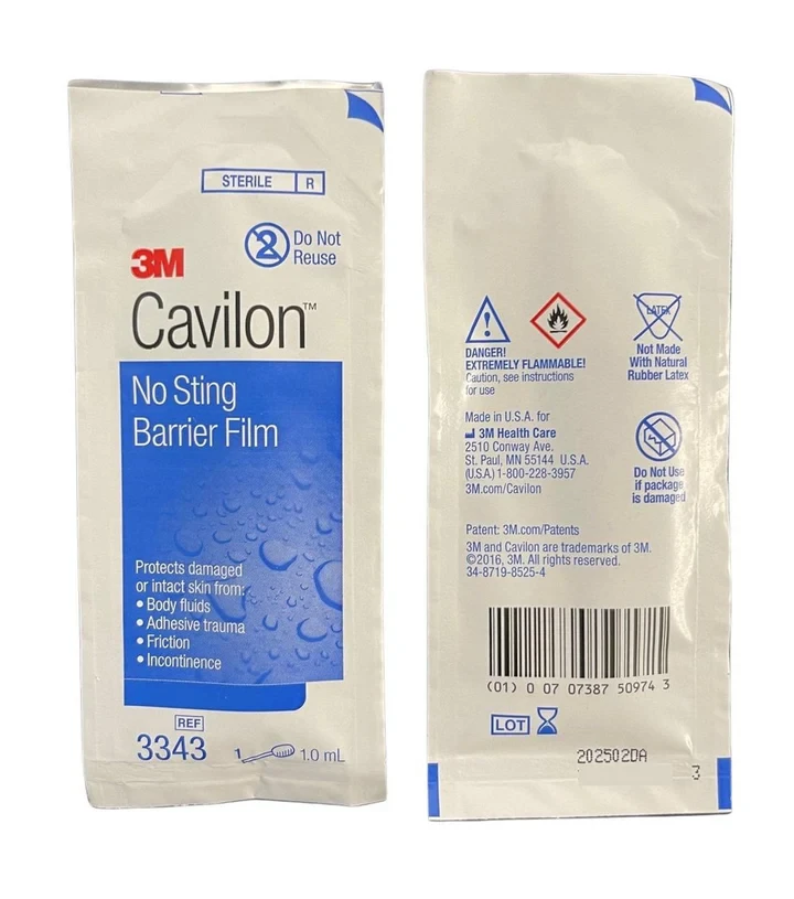 3M Cavilon No Sting Barrier Film is an alcohol-free moisture barrier. It contains unique ingredients called polymers that form a waterproof, protective coating on the skin. It is breathable and transparent allowing for continuous visualisation and monitoring of skin. It is flexible and conforms to the skin during movement or position changes. The products unique 3M formulation contains a blend of not one but two polymers, including a Terpolymer and a Homopolymer (plasticiser). The Terpolymer is derived from three distinct monomers, that provides a protective coating on the skin, creating a highly effective barrier. The Homopolymer enhances the films ability to flex with the skin and helps to maintain a continuous, protective coating. Other barrier films contain only one polymer and some utilise alcohol as a solvent. Completely alcohol-free formula will not sting even when applied to damaged or denuded skin Clinically proven to provide up to 72 hours of protection from incontinence for cost-effective prevention Sterile delivery systems including peel-down packaging Non-cytotoxic: will not interfere with skin or wound healing Hypoallergenic Won`t clog or reduce absorbency of diapers or pads Provides protection from adhesive trauma Compatible with chlorhexidine gluconate.