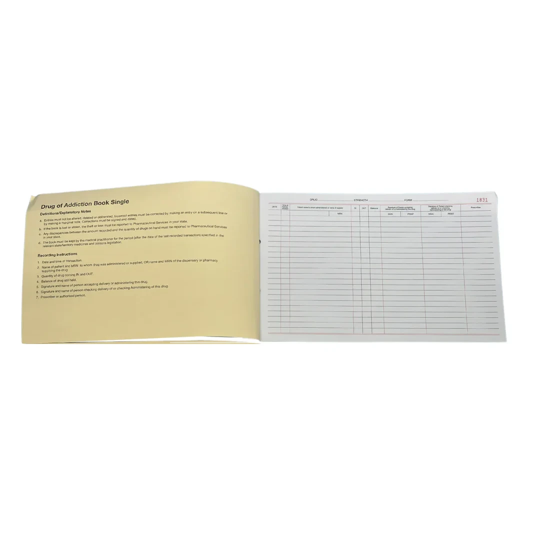 Drug of Addiction Admin (single drug) Books are printed using 70gsm paper text with a buff manilla cover, quarter bound. Single drug per page.
