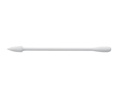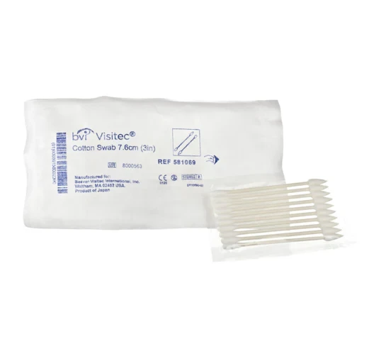 Pointed end may be used as a second instrument to absorb blood and fluid, move sutures and manipulate tissue. Rounded end may be used for scleral depression. Tightly wound ends create less linting than other cotton swabs. 7.6 cm (3 in) overall length. 10 per pouch, 25 pouches per box.