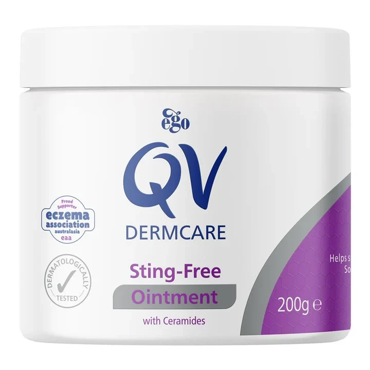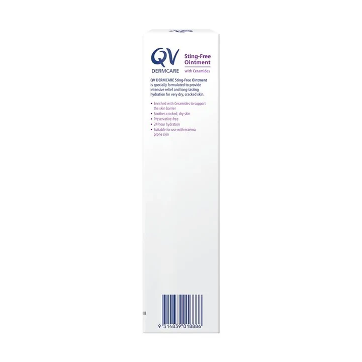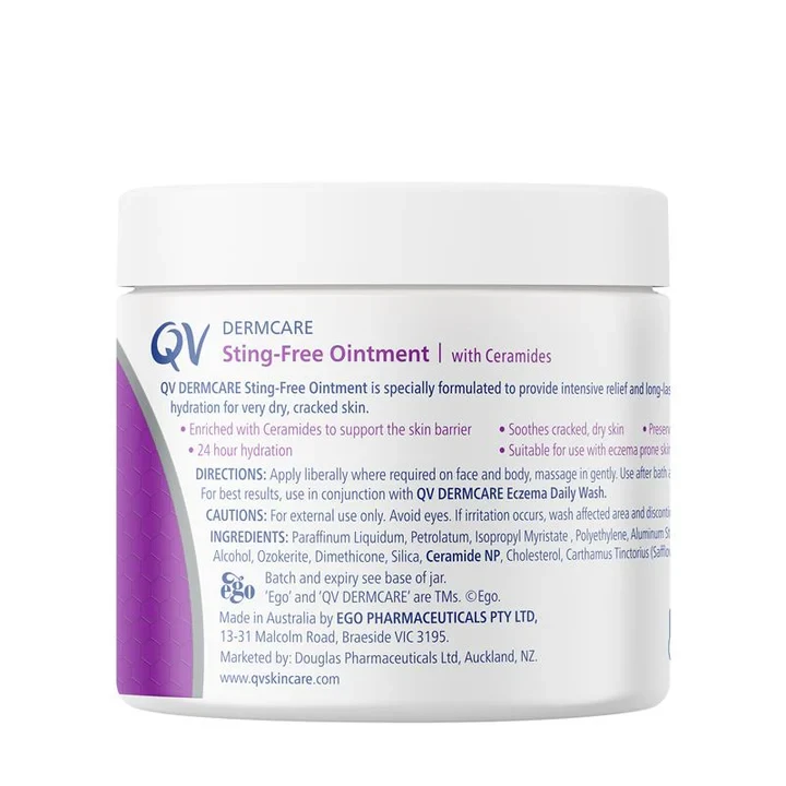 QV Dermcare Sting-Free Ointment is a water-free formula that helps provide hydration whilst soothing dry, cracked skin without stinging, for up to 24 hours. Formulated with Ceramides EOP and NP, which are crucial components of the skin barrier, have been shown to support overall skin barrier function. Suitable for use with eczema-prone skin.