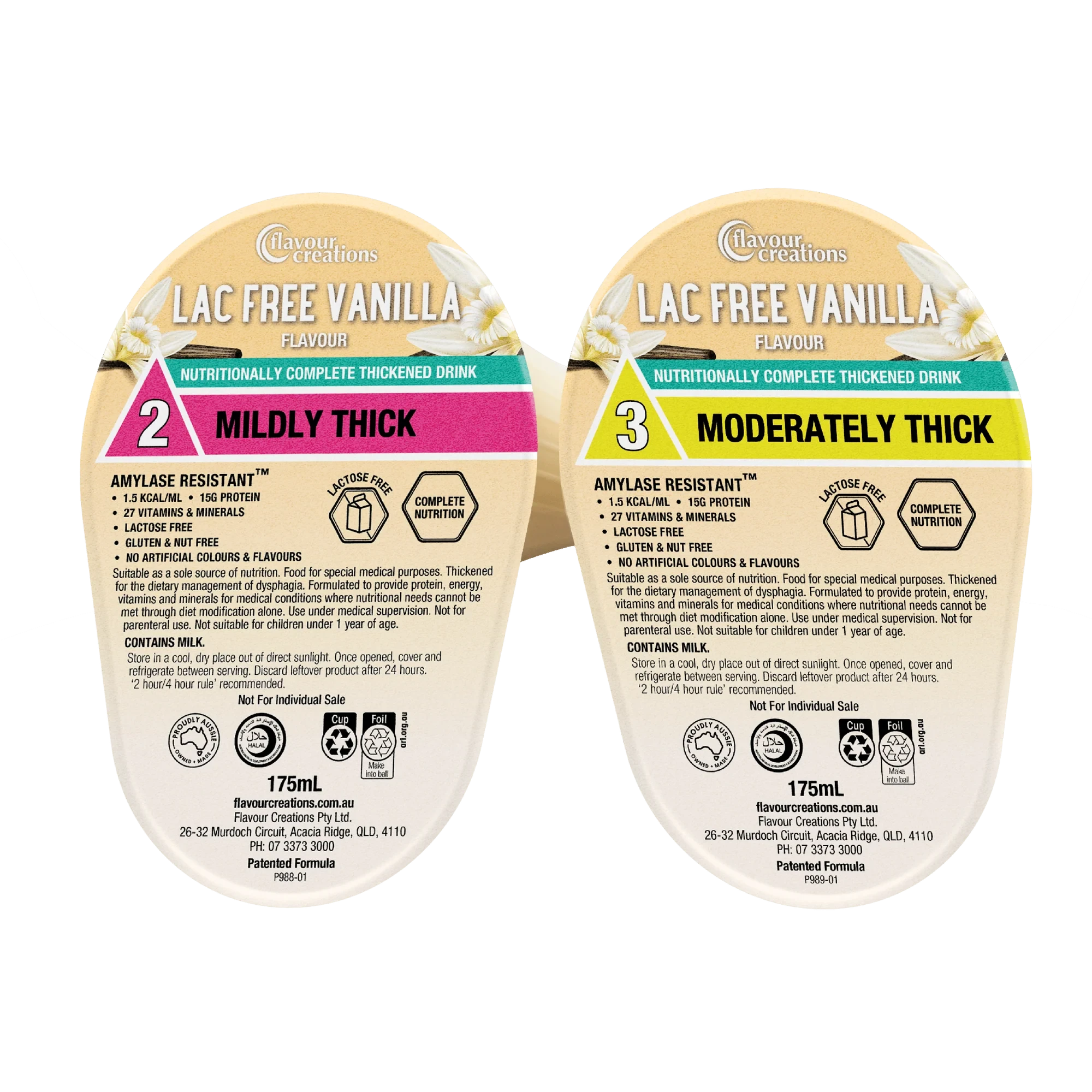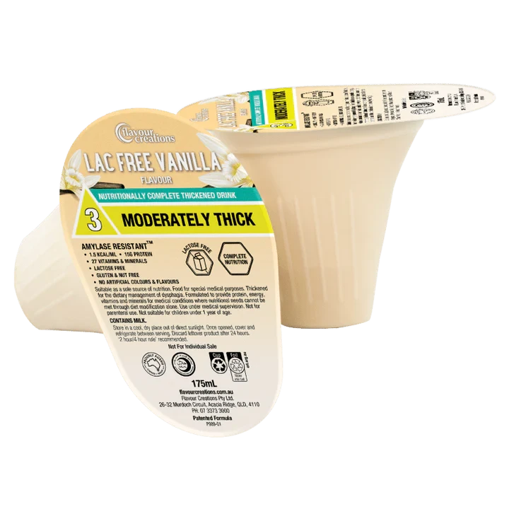 Flavour Creation Lactose Free Vanilla is a delicious ready-to-drink thickened supplement, that delivers 15 grams of protein and 27 vitamins and minerals. This complete nutrition supplement is available in IDDSI Level 2 & 3. Lactose Free Nutritionally Complete Vanilla is packed in our award-winning patented Flavour Creations Dysphagia Cup, specifically designed for those with swallowing difficulties (dysphagia).