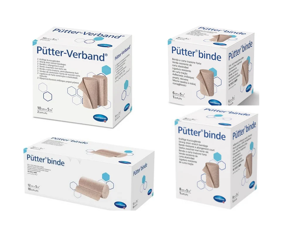 Hartmann Puettebinde is an especially strong, short-stretch bandage with textile elasticity of approx. 90%. Puettebinde is designed for extra high compression; after varicosclerosation, in all acute and chronic venous obstructive oedema, leg ulcers and thrombophlebitis.