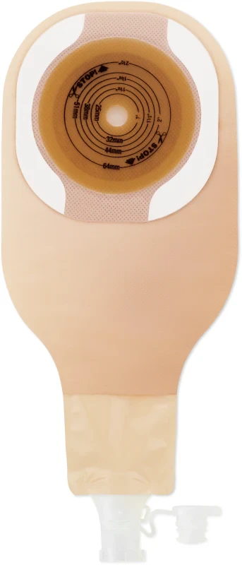 A one-piece, drainable pouching system with an integrated soft tap at the bottom of the pouch, which allows it to be connected to a bedside collector without the use of an adapter. These pouches are most suitable for colostomies or ileostomies with liquid output. The Flextend™ barrier is an extended wear skin barrier that is durable and offers high resistance to erosion. The AF300™ filter allows for slow release and deodorization of gas from the pouch. Soft, beige ComfortWear™ pouch panels help provide comfort.