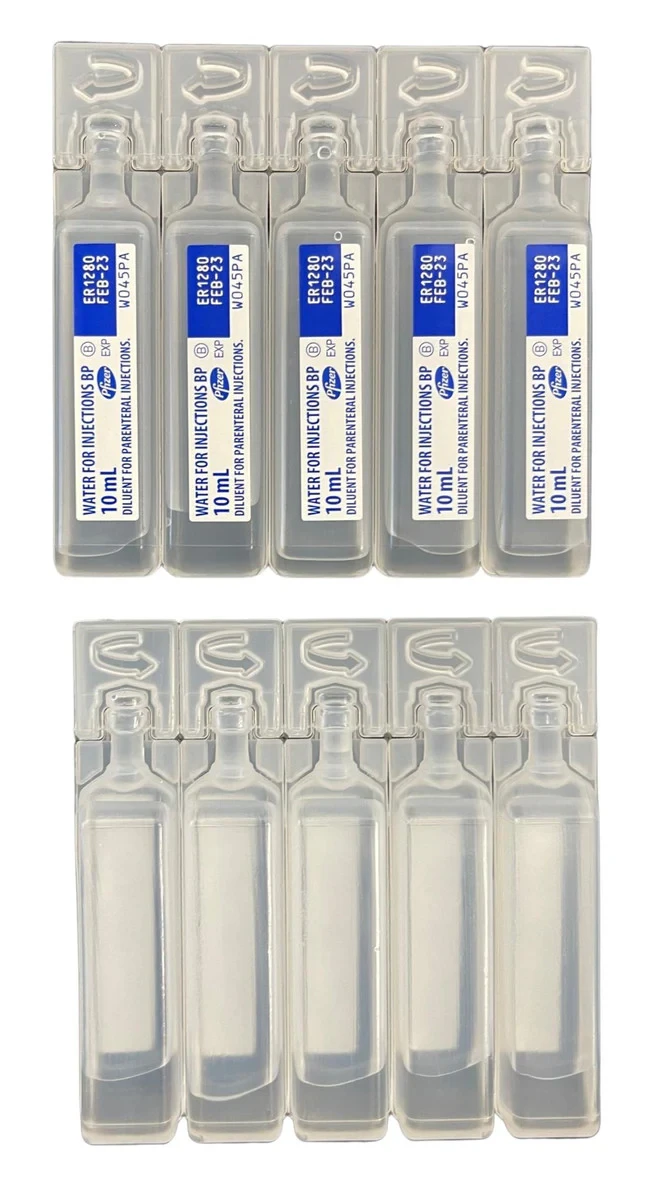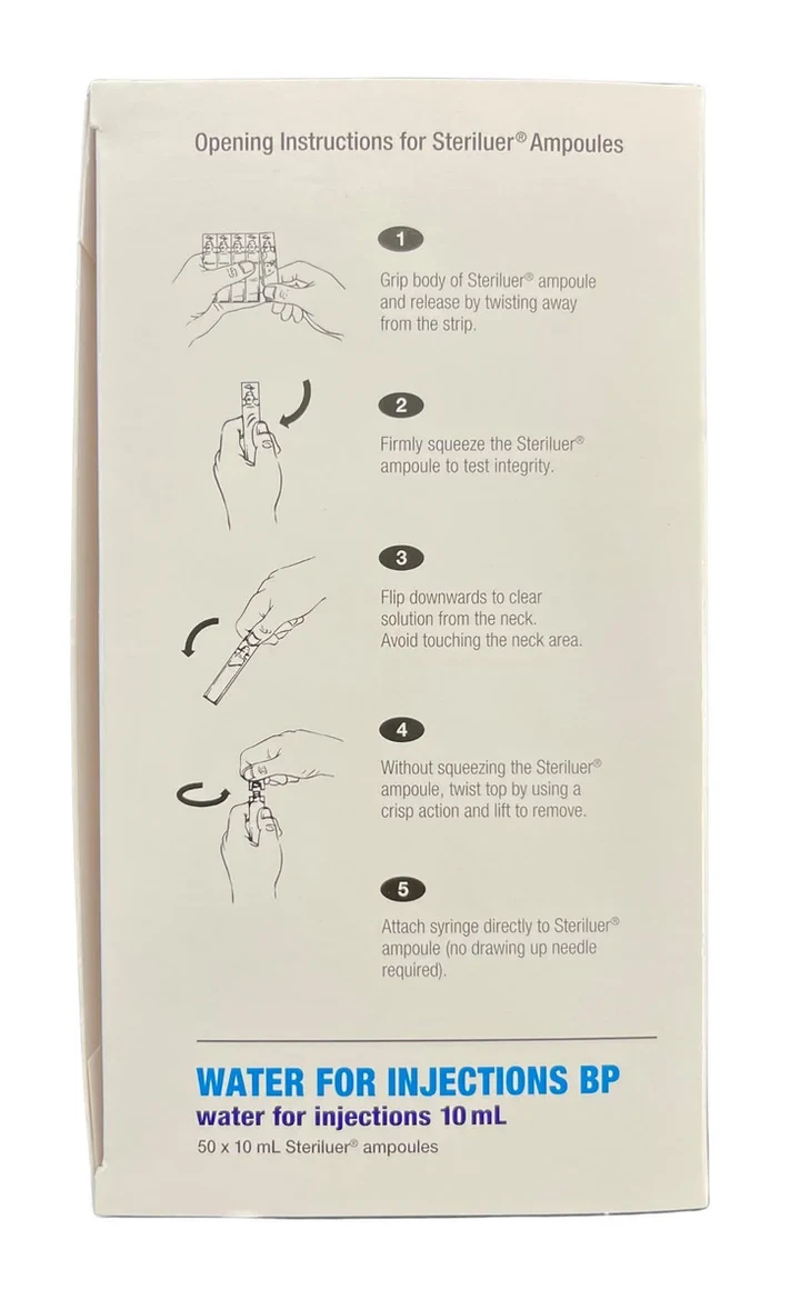 Water for Injection BP 10ml Steriluer Ampoules (25020010) comes in a box of 50 per box. This product, known as WATER FOR INJECTIONS BP, is an essential component for both medical professionals and individuals seeking sterile water for various purposes.