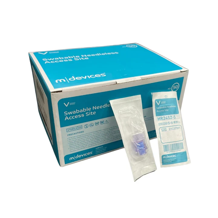 The swabable, split septum, access site is needle free and the lipid resistant valve offers high flow rates of up to 550mL/min and can support up to 300 access events for both fluid injection and fluid aspiration. It is Luer activated and designed for use with Luer lock and Luer slip connectors. No additional devices are required for activation and a small twist is all that is required to ensure a firm connection even with Luer slip syringes.