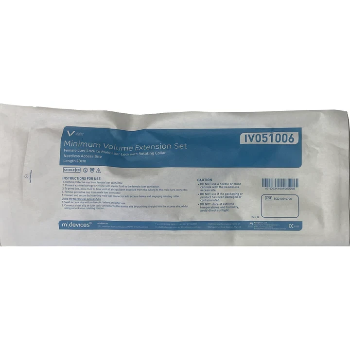 Mdevices IV Minimum Volume Extension Set with Needleless Access Site, non-return valve is 20cm in length. This set is lipid resistant and has a female luer lock to male luer lock with rotating collar. The set should always be primed prior to connecting to a peripheral catheter or access device on an IV administration set. For more information, click PDS and IFU.