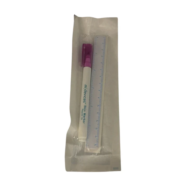 m|devices Surgical Skin Marker Pens are a specific type of pen used to outline/mark the surgical incision site on the skin. The pen is latex free, non‐cytotoxic and has been tested for biological safety in compliance with ISO10993 for skin irritation and sensitization. The marking agent is based on gentian violet, a traditional marking agent which has wide tolerance within the population. Surgical Skin Marker Pens are available in regular and fine tip with ruler and labels.