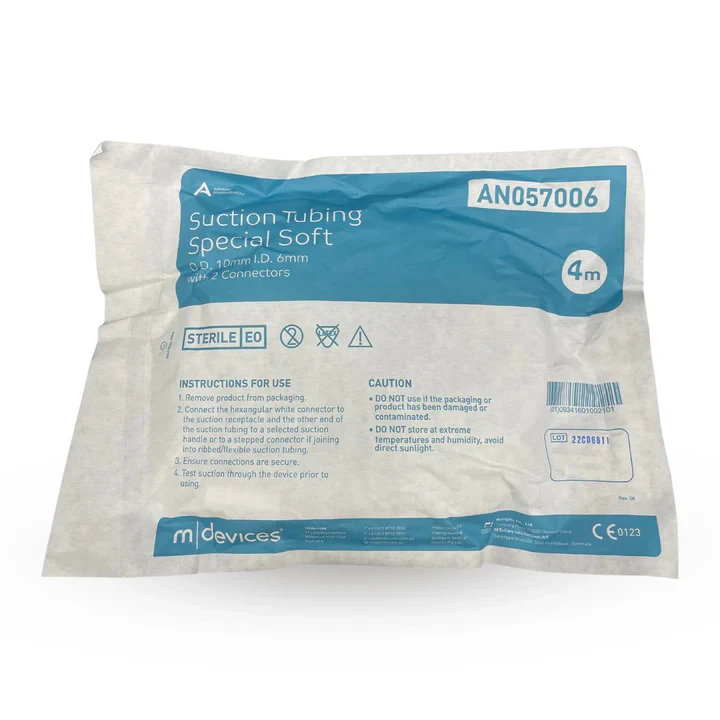 m|devices sterile Suction Tubing is available in smooth flexible, ribbed and special soft tubing in a variety of different lengths with one or two hexangular connectors or stepped connectors. The Suction Tubing is intended to be connected to an instrument (Yankauer, Poole, Ferguson/Frazier suction handles) to clear blood and large quantities of fluid from the surgical field during surgery, additionally can be used to remove saliva, secretions and vomit from the airway. One end of the suction tubing connects to the instrument of choice and the other is attached to a receptacle which is connected to wall suction or a stand-alone device. Special Soft Suction Tubing is primarily used with Ferguson/Frazier suction handles when finer manipulation is required during surgery e.g. ENT and neuro procedures.