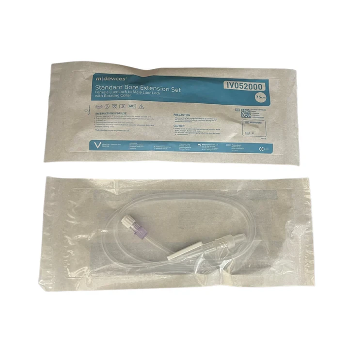 m|devices IV Standard Bore Extension Set has a slide clamp and is 75cm in length. This set is lipid resistant and has a female luer lock to male luer lock with rotating collar. The set should always be primed prior to connecting to a peripheral catheter or access device on an IV administration set.