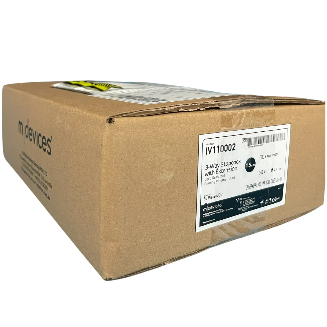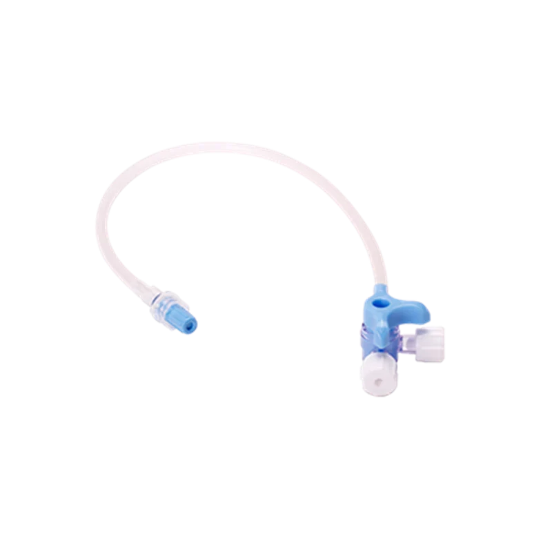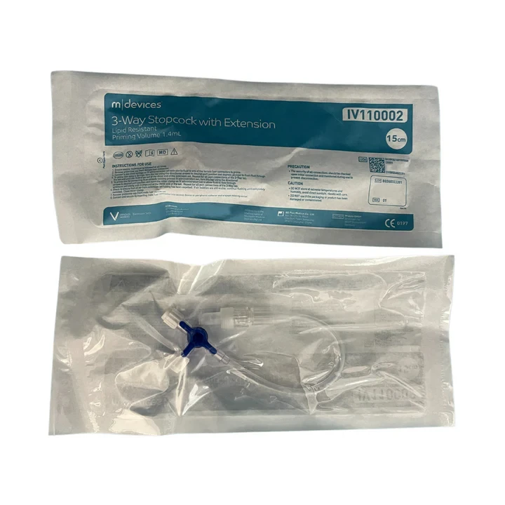 m|devices 3-Way Stopcock with 15cm, 25cm, 50cm, 80cm or 100cm Standard Bore Extension Set is lipid resistant. Flow directional arrows are visible on the tap to assist the clinician with flow direction. Male luer lock with rotating collar and Stopcock has two female luer connections with caps. IV extension sets with Stopcock should always be primed prior to connecting to a peripheral catheter or access device on an IV administration set.