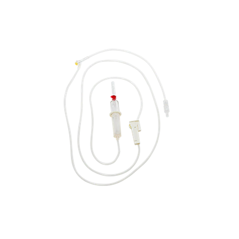 The Transfusion Set includes a single vented spike attached to a drip chamber with a 200μm filter. The 245cm kink resistant standard tubing with male luer lock connector and rotating collar. It is made from medical grade PVC. There are two swabable Needleless Access Sites and a non-return valve.