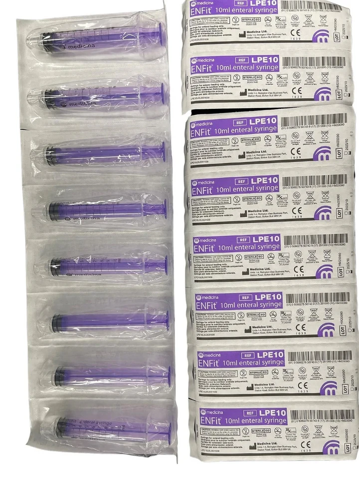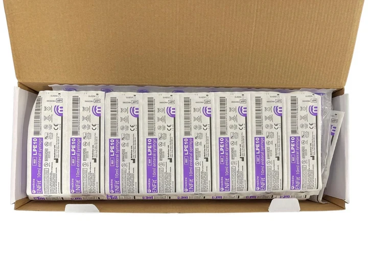 ENFit single use syringes for enteral delivery in line with ISO 80369-3.