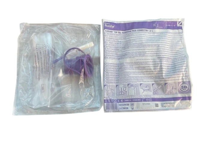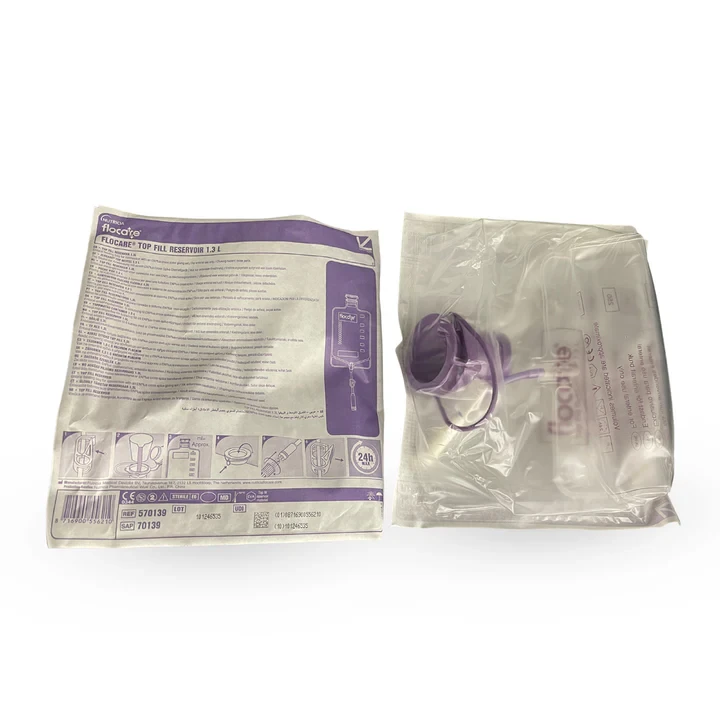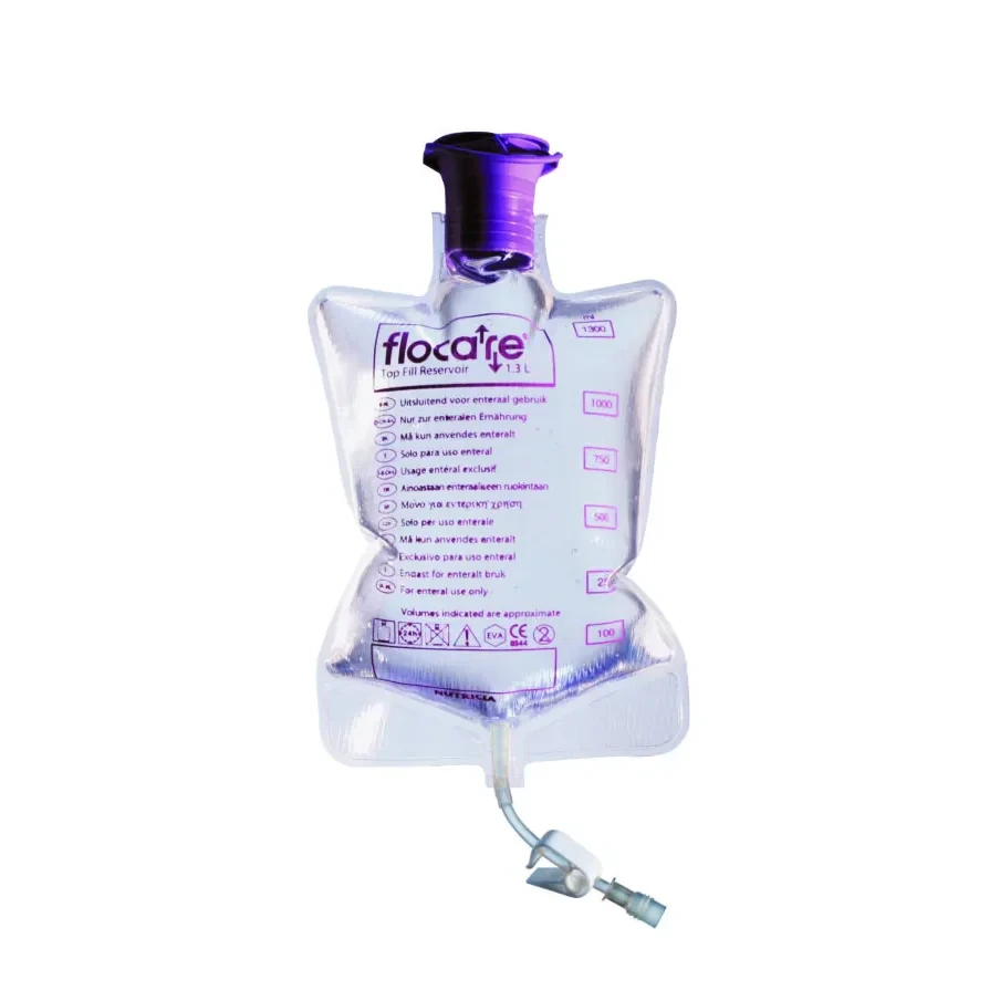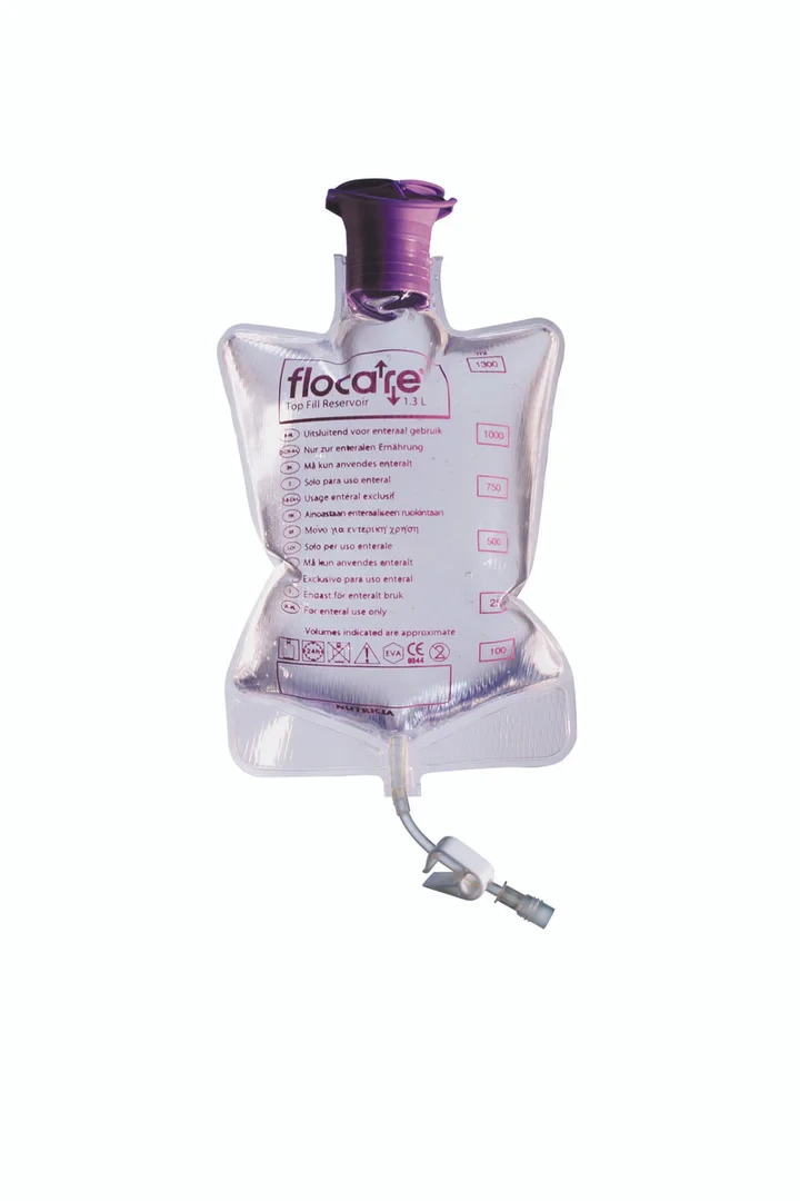 The 1.3L top-fill reservoir is an empty ethylene vinyl acetate (EVA) bag compatible with Flocare® pack feeding sets. It is designed for the delivery of decanted product, reconstituted powder-based formula, and/or water via an enteral feeding pump or gravity feeding system.