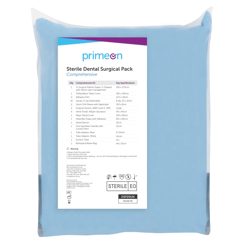 The PrimeOn Comprehensive Sterile Dental Surgical Pack allows dental professionals to successfully prepare for surgical procedures and create sterile fields around your patient and their surrounds. Every component in this pack is sterilised with ethylene oxide and sealed together in a headed bag with a sterilisation indicator label. This pack is recommended for procedures including but not limited to implant surgery, extractions, maxillofacial surgery, orthognathic surgery, TMJ surgery, cleft-palate, mandibular surgery and facial aesthetics.