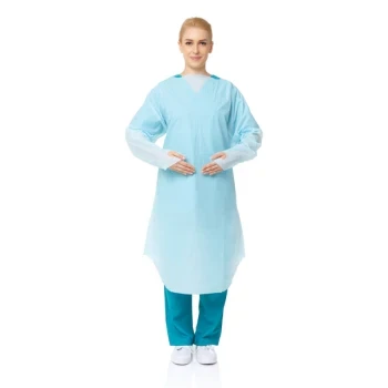 The PrimeOn Thumb-Hook Impervious Gown provides a high level of protection for healthcare workers against blood and bodily fluids. The gown features an impervious film to liquid splashes, a thumb-hook design to ensure the gown comfortably stays in place over the wrists while performing tasks, and an open back for comfort. This gown is ideal for decontamination, patient contact and general cleaning tasks.