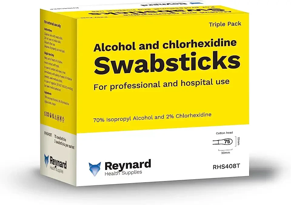 A wetted cotton head adhered to a 10cm plastic stick which is used to sanitise the skin. Each swab stick is impregnated with a clear solution of 2% Chlorhexidine digluconate & 70% Isopropyl alcohol. Each sachet contains 3 swabsticks.