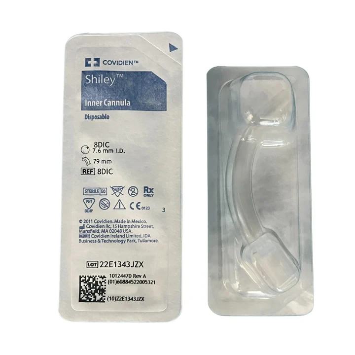 Disposable inner cannula (DIC) with integral 15 mm snap-lock connector, individually sterile packaged, required for use with DFEN and DCFN. b Spare inner cannula (SIC) with red, color-coded twist-lock connector, for temporary use during cleaning or removal of the inner cannula of Shiley™ tracheostomy tubes, may be used with FEN, CFS, and CFN. c Disposable inner cannula, fenestrated (DICFEN) is for use with DCFN and DFEN tracheostomy tubes. d White 15 mm cap (CAP) attaches to the fenestrated inner cannula with green 15 mm connector to permit breathing through the fenestration and upper airway. e Decannulation plug (DCP) closes the proximal end of the FEN and CFN tubes to permit breathing through the fenestration and upper airway. f Disposable decannulation plug (DDCP) closes the proximal end of the DCFN and DFEN to permit breathing through the fenestration and upper airway.