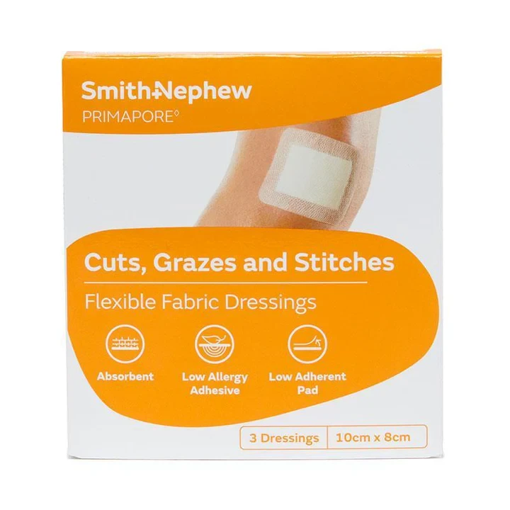Primapore Flexible Fabric Dressing is a self-adhesive, sterile fabric-island type wound dressing. It combines a breathable, flexible backing with an absorbent wound pad, and is designed to help protect minor wounds, sutured wounds, cuts, grazes or abrasions.