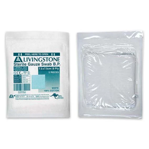 Sterile Gauze Swabs, 7.5 x 7.5 cm x 8 ply, White, 100 Percent Cotton, 5 per Pack, 500 Packs per Carton
