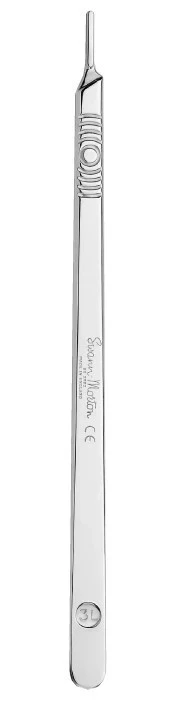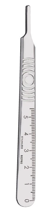 Swann Morton Scalpel Handles are stain steel handles designed for training and marking correct surgical sites and investigating traumatic injuries. These handles include a graduation or measure on the front or reverse side and are wrapped individually. Scalpel Handles are available in longer or shorter styles and in a variety of sizes.