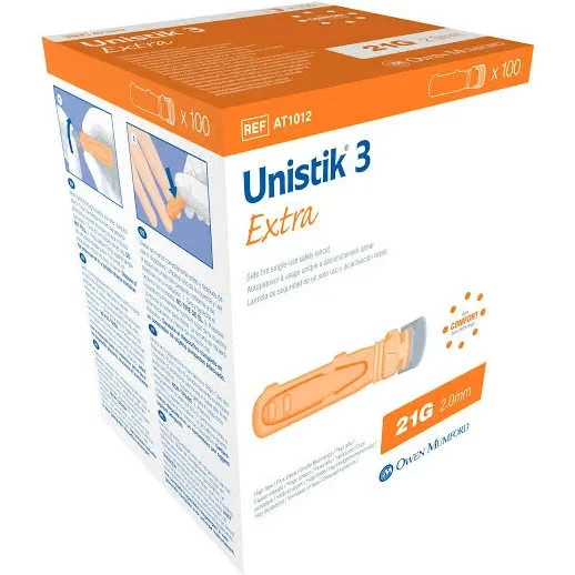 Unistik 3 Extra 21 Gauge Safety Lancet with increased penetration depth for increased blood sample. Gauge: 21G Depth: 2.0mm High Blood flow Safe The Unistik 3 needle point is hidden before use and automatically retracts after use to avoid accidental needle stick injuries and cross infection. Unistik 3 has an additional visual lockout feature. Should an attempt be made to misuse the device, there is a clear indication to the operator that the device has been used and should be disposed of in a suitable sharps container. Unistik can not be re-used or re-primed. Easy to use The Unistik 3 range is colour coded for easy recognition. Unistik 3 is pre-set and ready for use. Just twist off the protective sterile cap and take the sample. Maximum comfort Side firing action to provide extra comfort for both patient and professional. Unistik 3 features unique Comfort Zone Technology that allows ultimate control and comfort when lancing by targeting the sensation and perception of pain. This masks the pain of lancing to maximise comfort.